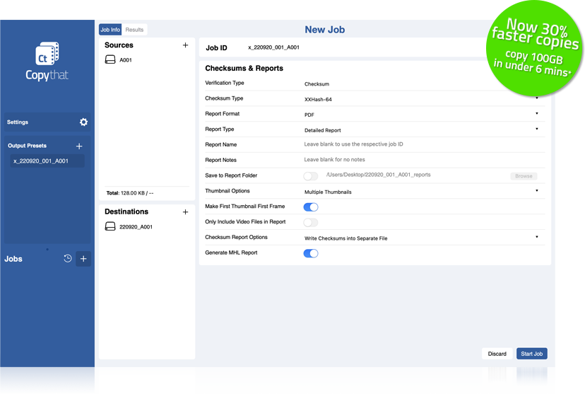 Once you have moved your media, you need to know exactly where it’s located at a moment’s notice. Copy That builds detailed reports (PDF, TXT, CSV), that include all relevant information such as naming, file status, checksum verification, start and finish dates, and more. Reports also include thumbnails so you can find the shot you need in seconds.